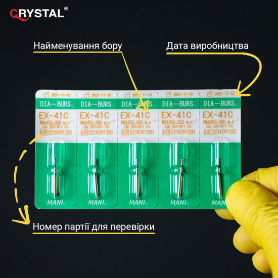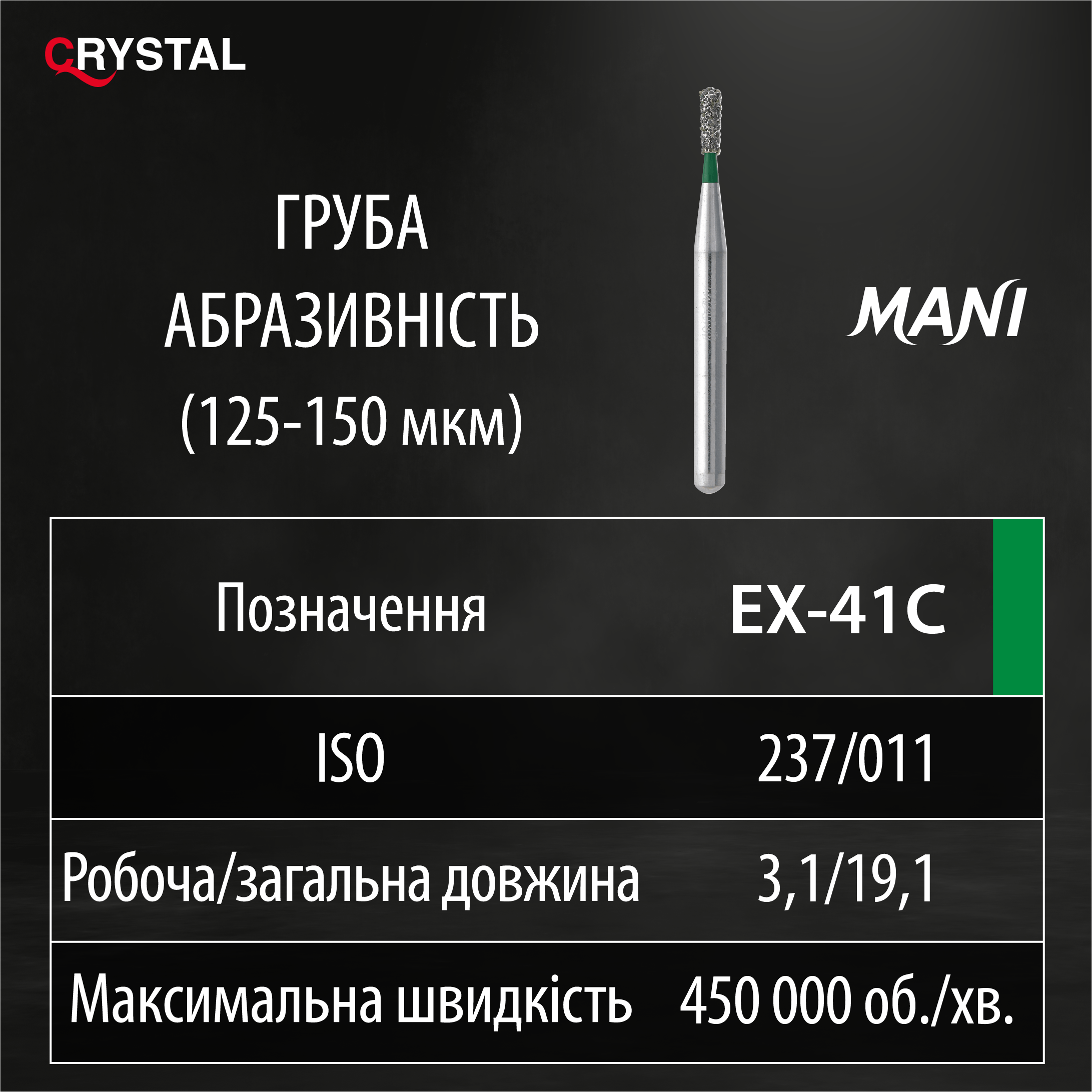 Алмазний бор EX-41C (Extra Shape - Додаткова форма). Подовжений грушоподібний, ISO 237/011, зелений, Mani (Japan)