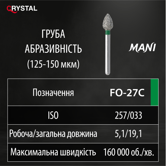 Алмазний бор FO-27С (Flame Ogival - Полум'яподібний стрілчастий кінчик). Оливка, ISO 257/033, зелений, Mani (Japan)