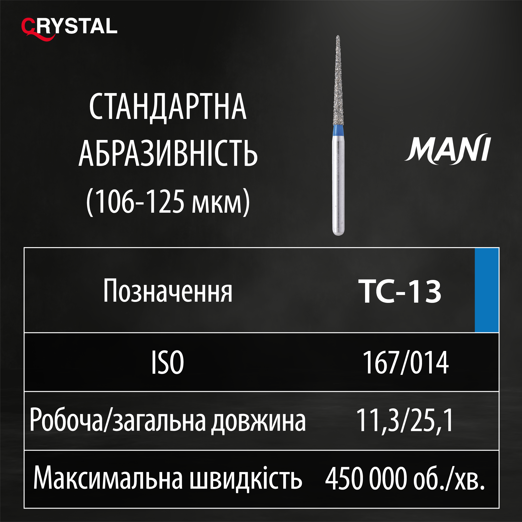 Алмазний бор TC-13 (Taper Conical - Конусоподібний плоский кінчик). Конус, ISO 167/014, синій, Mani (Japan)