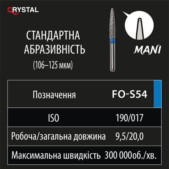 Алмазний бор FO-S54 (Flame Ogival - Полум'яподібний стрілчастий кінчик). Полум'яподібний, ISO 298/015, синій, Mani (Japan)
