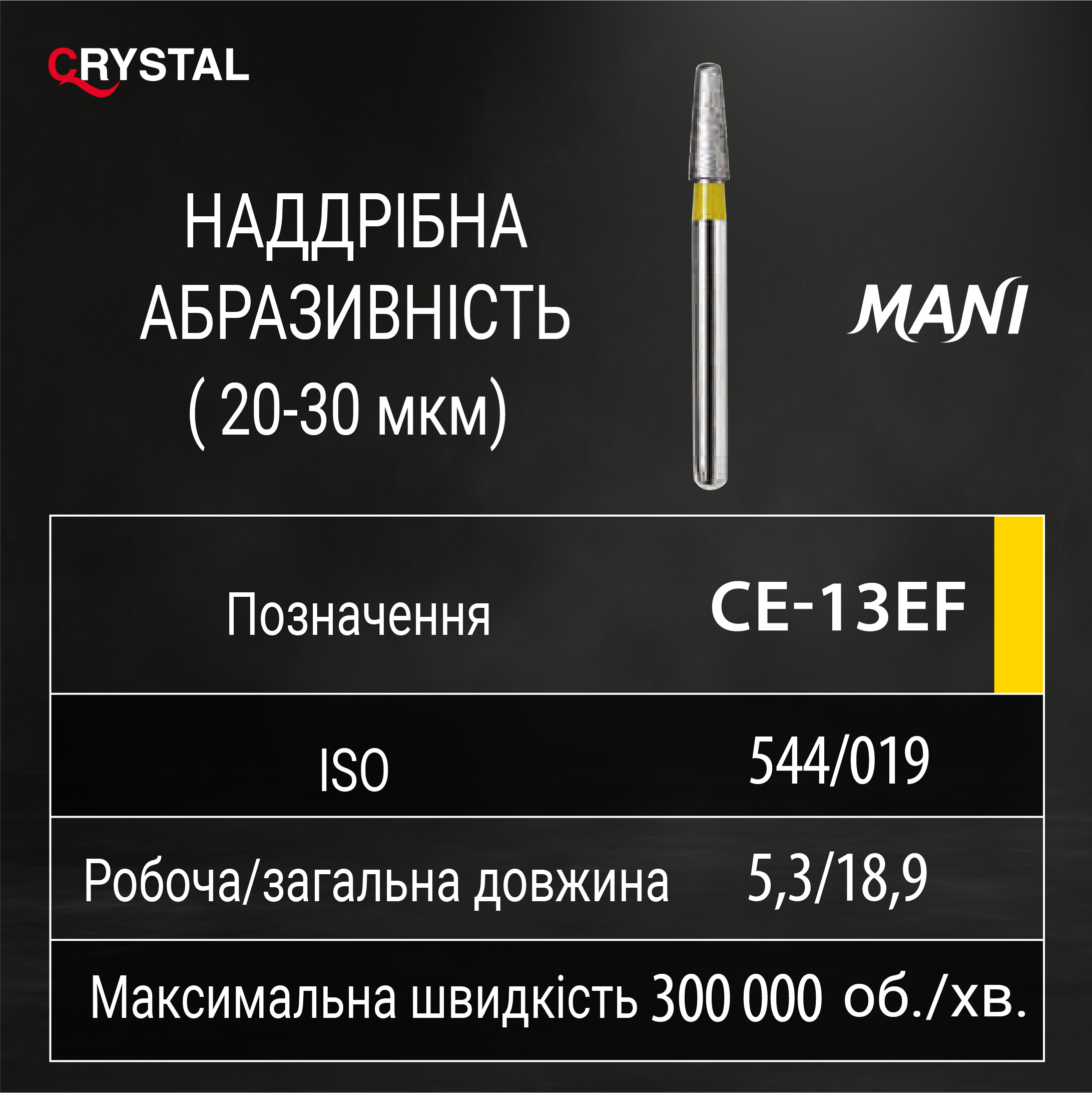 Алмазний бор CE-13EF (Cerec Related - Для оброблення під Cerec). Усічений конус, ISO 544/019, жовтий, Mani (Japan)