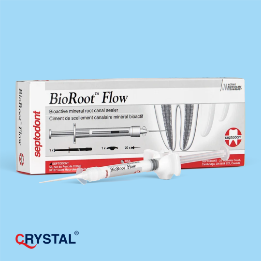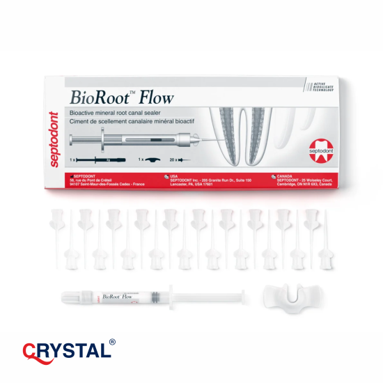 BioRoot™ Flow — ін’єкційний біокерамічний сілер на основі кальцій-силікатної технології (біоактивна мінеральна матриця) для постійної обтурації кореневих каналів у поєднанні з гуттаперчею. Поставляється у переднаповненому шприці, легко вводиться через тонкі канюлі, працює у вологому середовищі та формує герметичне з’єднання з утворенням апатиту.
