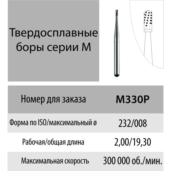 Карбідний бор М330P. Грушеподібна форма. Робоча довжина: 2,00 mm. Загальна довжина 19,3 mm ISO/D: 232/008. Mani (Japan)