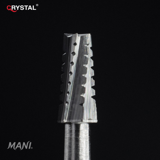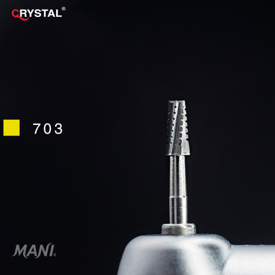 Карбідний бор, усічений конус (поперечні насічки), № 703. Оскільки робоча частина і хвостовик є одним суцільним елементом, ймовірність пошкодження твердосплавного бора MANI є мінімальною.Матеріал: карбід вольфраму і нержавіюча сталь.