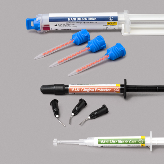 Mani Bleach Office kit — повний набір для офісного відбілювання зубів у стоматологічному кабінеті. До його складу входять: фотополімерний гінгівальний бар’єр для захисту ясен, високоефективний гель для відбілювання з 35% перекису водню та засіб для догляду після відбілювання, який зменшує чутливість і підтримує ремінералізацію емалі.