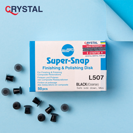 Super-Snap Black mini L507 — абразивні міні-диски зернистості Coarse (8 мм) для точного та контрольованого первинного контурингу композитних реставрацій у важкодоступних ділянках. Конструкція без металевого центру забезпечує безпечну роботу біля краю реставрації, у пришийковій та міжзубній зонах.