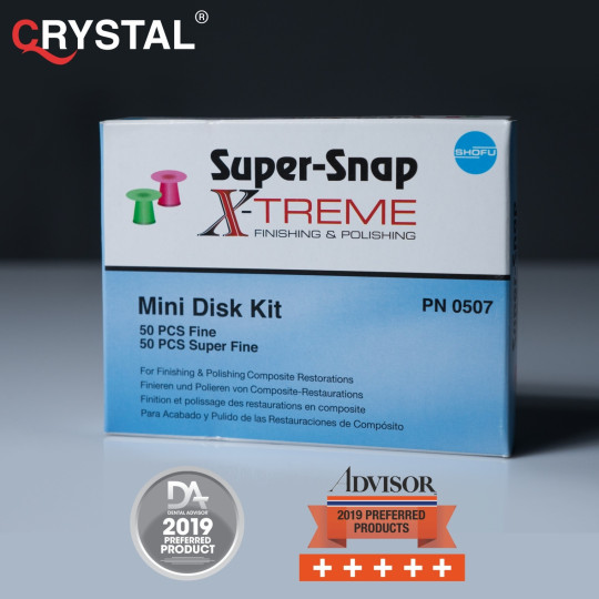 Super-Snap X-treme — система полірування від Shofu, яка забезпечує блиск усього за 2 кроки: Green (фініш) → Pink (суперполіровка). Міні-диски діаметром 8 мм ідеально підходять для пришийкової зони, міжзубних контактів і дрібних поверхонь.