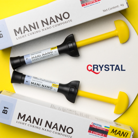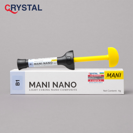 MANI Nano — фотополімерний нанокомпозит зі зменшеною чутливістю до навколишнього світла (до 3 хвилин), що забезпечує оптимальний робочий час для точного моделювання реставрацій.